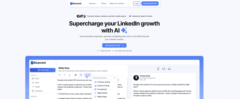 Navigating LinkedIn content creation can often feel overwhelming. With the right tools, however, you can streamline the process and enhance your professional presence. Bluecast is here to simplify your LinkedIn content journey with its AI-driven features. This review will dive into what makes Bluecast a standout choice for busy professionals and how it can elevate your LinkedIn strategy.