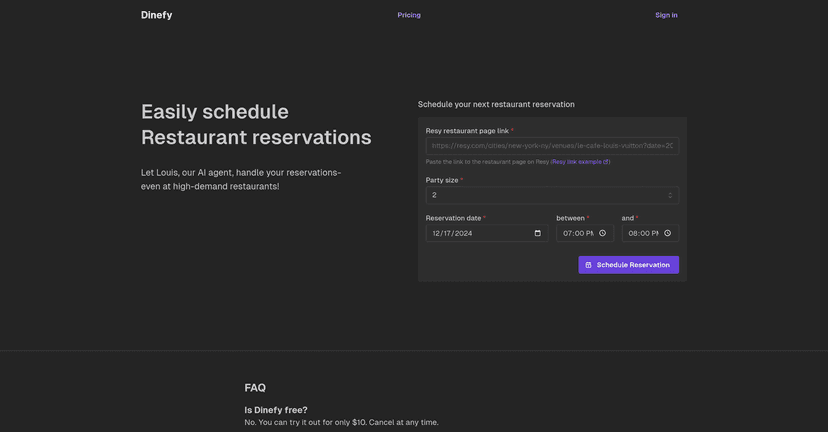 In conclusion, Dinefy proves to be an excellent tool for anyone looking to make restaurant reservations with less hassle. Its AI capabilities and integration with Resy open doors to busy eateries while maintaining an easy-to-use interface. However, keep in mind the $10 fee and the requirement of Resy credentials. If you often find yourself struggling to book a table at high-demand restaurants, Dinefy might just be the solution you need.