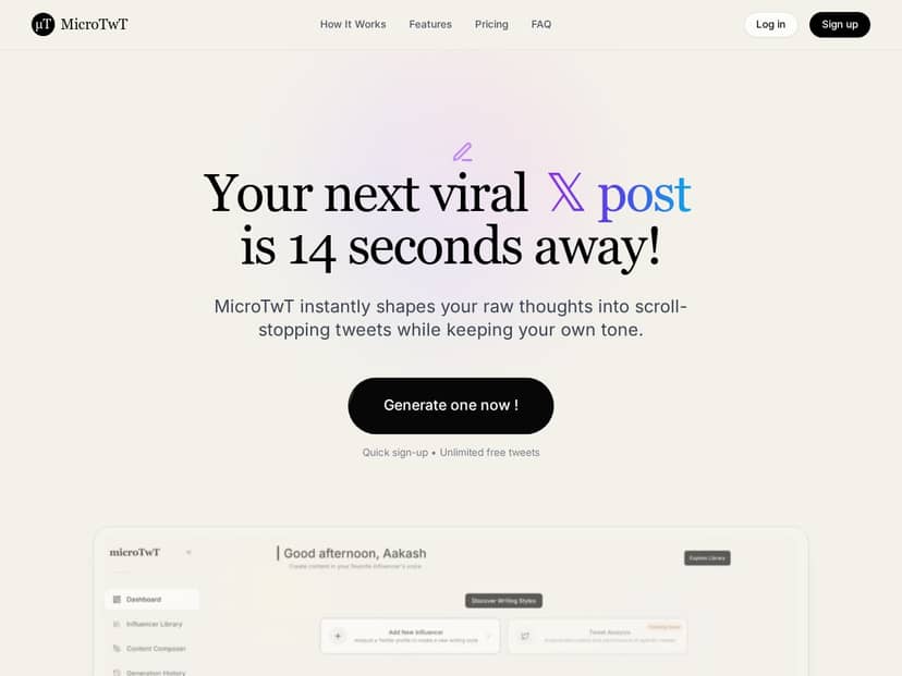 ¿Buscas hacer que tus publicaciones en Twitter se destaquen? MicroTWT promete convertir tus ideas en tweets virales sin esfuerzo. Lo he probado yo mismo y lo encontré fácil de usar y efectivo. ¿Tienes curiosidad sobre cómo funciona? Quédate conmigo mientras profundizo en este asistente de Twitter impulsado por IA y comparto lo que descubrí.