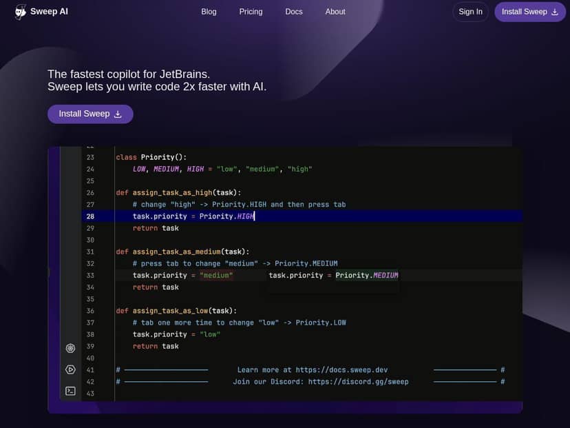 En general, Sweep es un prometedor asistente de IA que mejora la productividad para los desarrolladores que trabajan en entornos JetBrains. Combina una potente automatización con un análisis profundo del código, lo que acelera la escritura de código y lo hace menos tedioso. Aunque hay una pequeña curva de aprendizaje y algunas consideraciones de rendimiento, sus beneficios para proyectos grandes o complejos son significativos. Si buscas una herramienta de IA que se integre a la perfección con tu IDE favorito, Sweep vale la pena explorarla.
