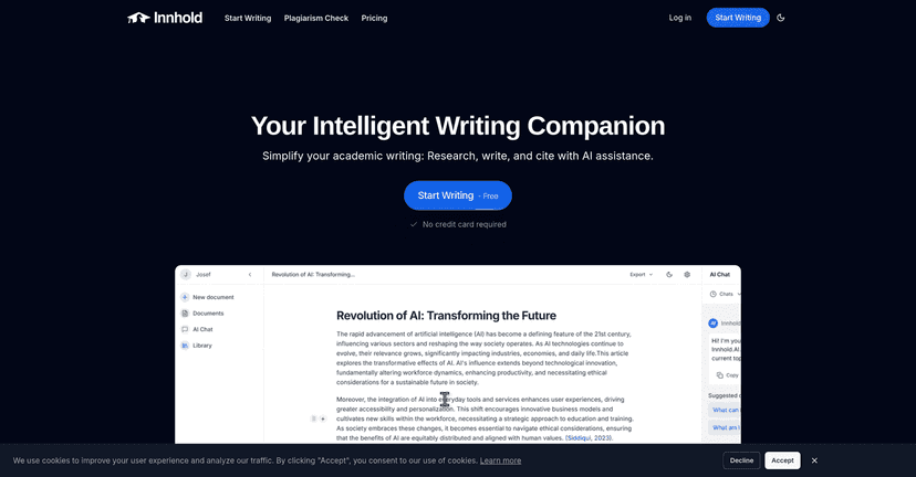 Innhold.ai is an innovative tool designed specifically for academic writers looking to streamline their research, writing, and citation processes. With its AI-driven features, it aims to assist users in creating well-researched, accurate academic content. This tool is still relatively new, and while there’s much to offer, it might take a bit of time to completely understand how to leverage its functionalities to their full potential.
