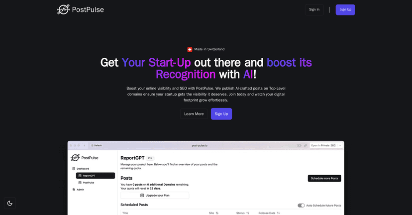 PostPulse stands out in the crowded content marketing landscape by focusing on AI-generated posts that are both high-quality and SEO-optimized. The platform is designed to take the hassle out of content creation for SaaS startups, making it easier for founders to engage their target audiences without spending hours brainstorming or writing. With features like auto-scheduling and premium domain publishing, PostPulse delivers valuable tools to help startups maintain a consistent online presence and grow sustainably.