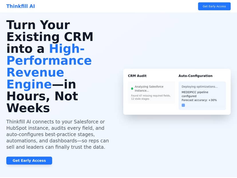 After trying out Thinkfill AI, I can say it’s a game-changer for sales teams seeking to get more from their CRMs. The setup was straightforward, connecting seamlessly to my Salesforce account. The auto-configuration feature impressed me—within minutes, my pipeline stages, automation rules, and dashboards were optimized without much manual effort. It’s like having an AI-powered assistant that refines your CRM workflows instantly. What stood out is the continuous data hygiene checks, which keep the system accurate and reliable. Overall, it’s a handy tool that enhances the way I manage customer data and sales pipelines.