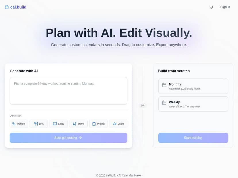 Looking for a quick way to create and customize calendars? cal.build promises to deliver fast, AI-powered calendar generation right at your fingertips. Whether you're planning a trip, managing a project, or organizing your week, this tool aims to make scheduling simple and effortless. Curious how it stacks up? Let's take an in-depth look at cal.build and see if it lives up to its promise.