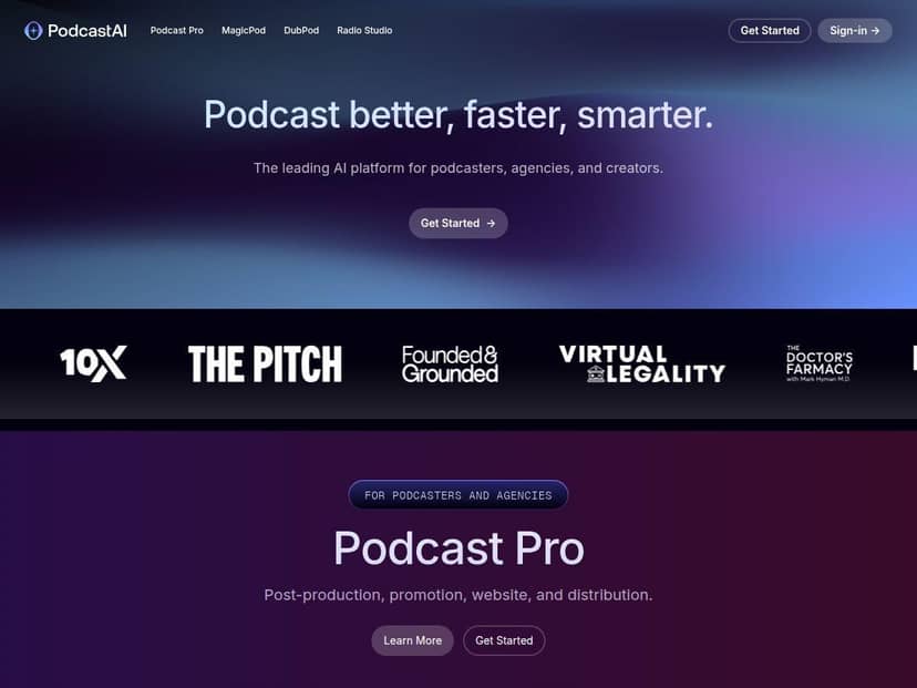 PodcastAI offers a few subscription plans, with the two main options being the Podcast Pro at $99 per month, which includes hosting, post-production, and promotion, and the MagicPod plan at $599 per month, offering fully AI-generated shows in your voice. Some sources list the Podcast Pro starting at $199/month, so it’s best to check their official site for current prices and features.