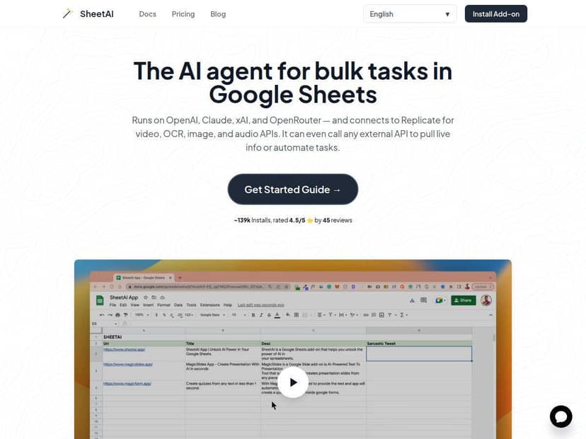 - Easy-to-use custom functions such as =SHEETAI(), =SHEETAI_LIST(), and =SHEETAI_TABLE()