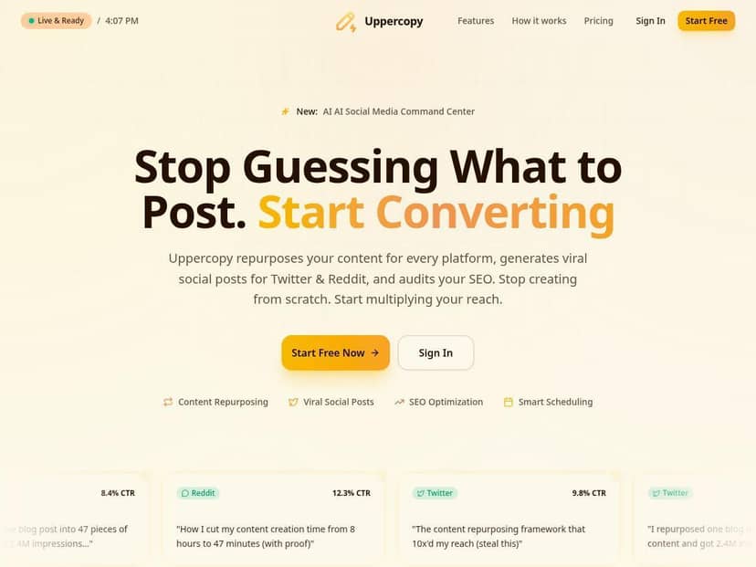 Looking for a smarter way to handle content for social media? Uppercopy promises to simplify your workflow with its AI-powered tools. Whether you're a creator or small business, this platform aims to save you time while boosting your online presence. In this review, I'll share my experience and help you decide if it's the right fit for your needs. Let’s explore what makes Uppercopy stand out and where it might still have room to grow.